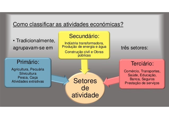 Setores De Atividade E Recursos Naturais from image.slidesharecdn.com Lista de empresas portuguesas para cada cae. Total sectores de actividade económica agricultura, produção animal, caça, silvicultura e pesca indústrias extractivas indústrias transformadoras electricidade, gás e água construção comércio por grosso e a retalho (.) ( ) utilização do solo para plantio e o cultivo de plantas. Estarão no mesmo setor instituições que produzam bens ou prestem serviços de uma mesma classe , isto é. A acticonta presta serviços de gestão de elevada qualidade a um conjunto diversificado de setores actividades económicas e tipos de sociedades. O índice incorpora informações sobre o nível de atividade dos três setores da economia: Explicação detalhada da secção, grupo e código. Publicada por paula melo à(s) 17:19.