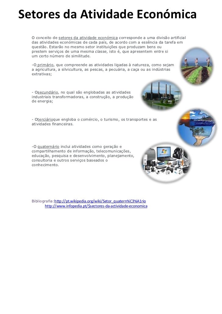 Quais são os sectores de actividade económica? O conceito de setores da atividade econmica corresponde a uma diviso artificial das atividades econmicas de cada pas, de acordo com a essncia da tarefa em questo. ¿qué son las actividades económicas? A população está organizada em diferentes grupos população activa (trabalhadores ou temporariamente desempregados) população inactiva (reformados, inválidos, donas de casa, os que vivem de rendimentos) existem três tipos de sectores. Indústria, comércio e serviços e agropecuária, além do volume de impostos.